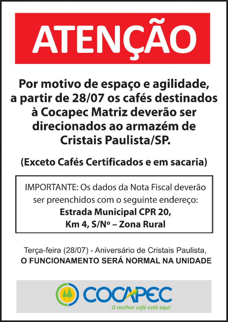 Cafés da Matriz devem ser direcionados a unidade de Cristais Paulista